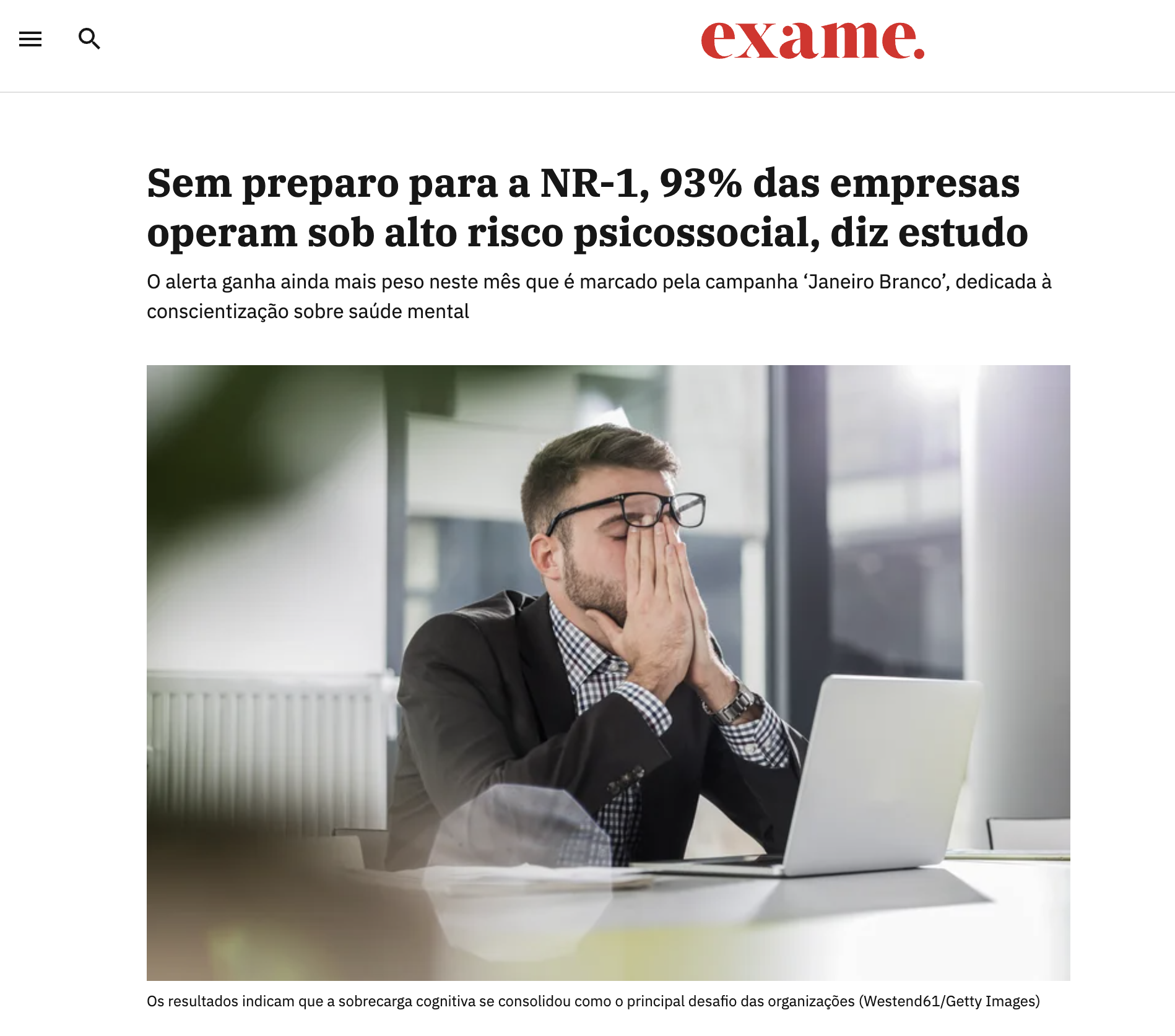 Ainda segundo a pesquisa “Índice de Fatores de Risco Psicossociais, desenvolvido pelo Zenklub, empresa especializada em saúde mental corporativa e divulgado pela Revista Exame, 93% das empresas operam sob alto risco psicossocial.